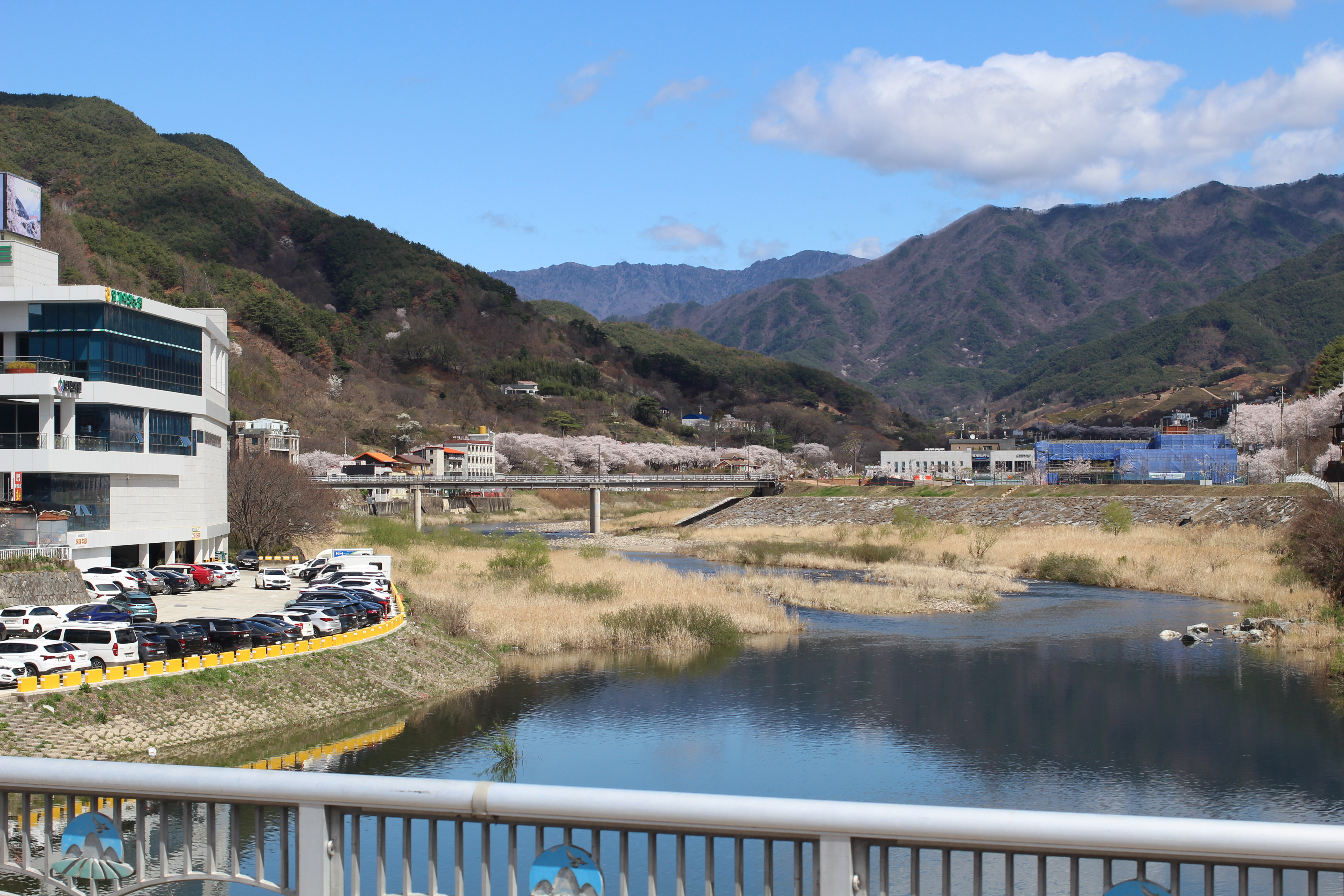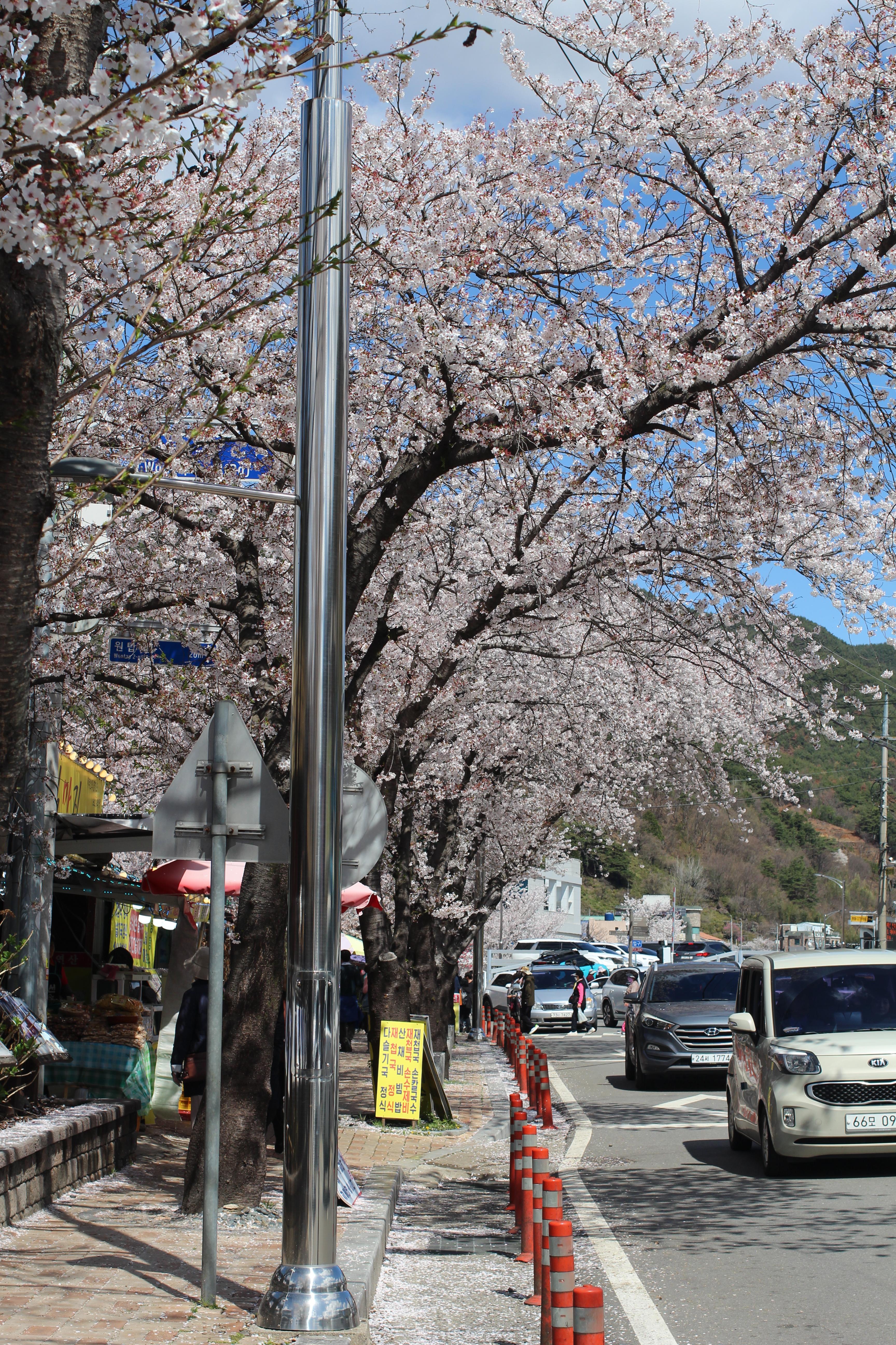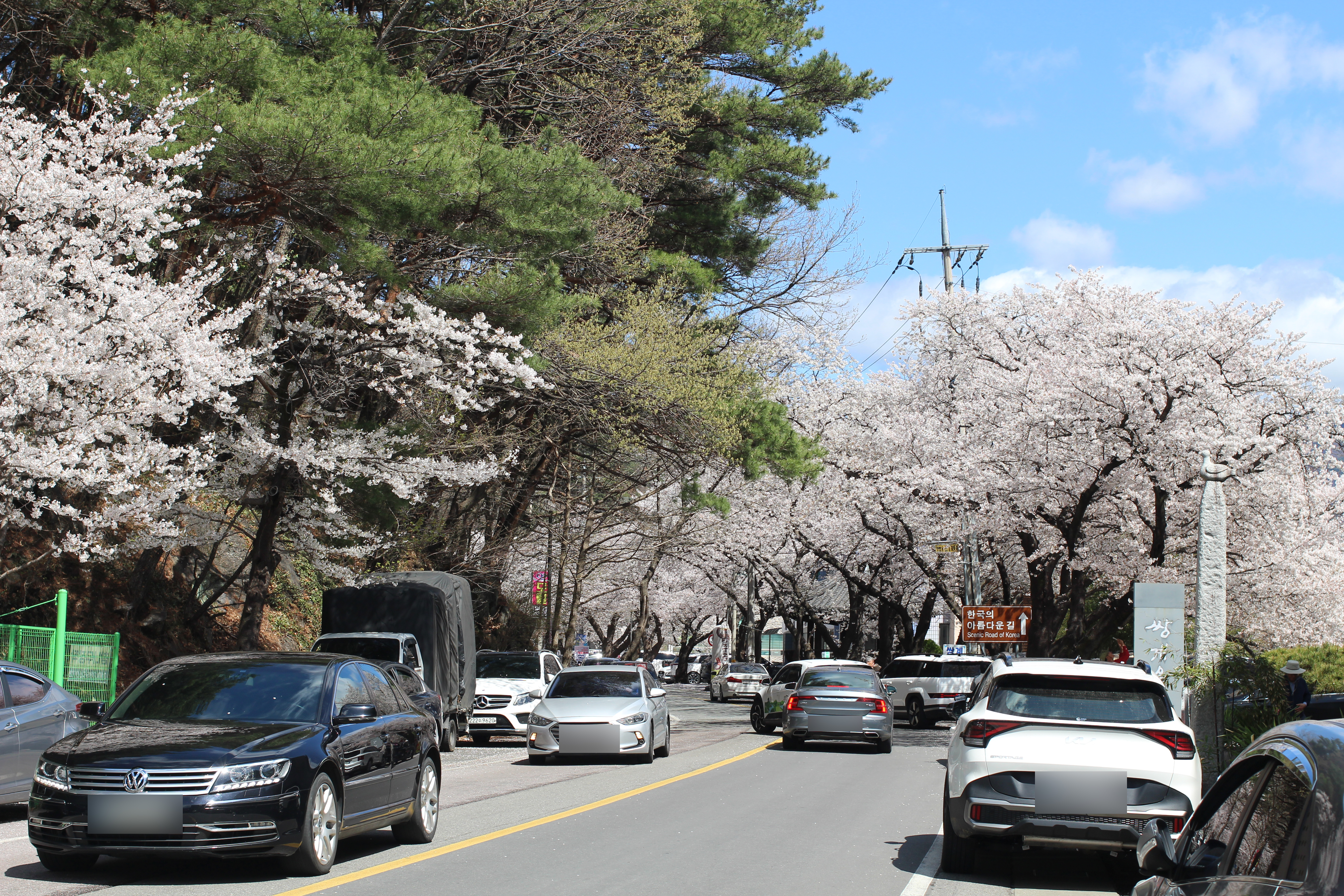 벚꽃 절정 시즌에는 도로가 극심하게 막히는 편입니다. 사진에서도 보이듯 차들이 줄지어 서있는 풍경이 이 계절의 일상입니다. 가능하다면 오전 이른 시간에 방문하거나, 아예 걸어서 꽃길을 즐기는 것을 추천합니다. 어차피 걷고 싶어지는 길이니까요.