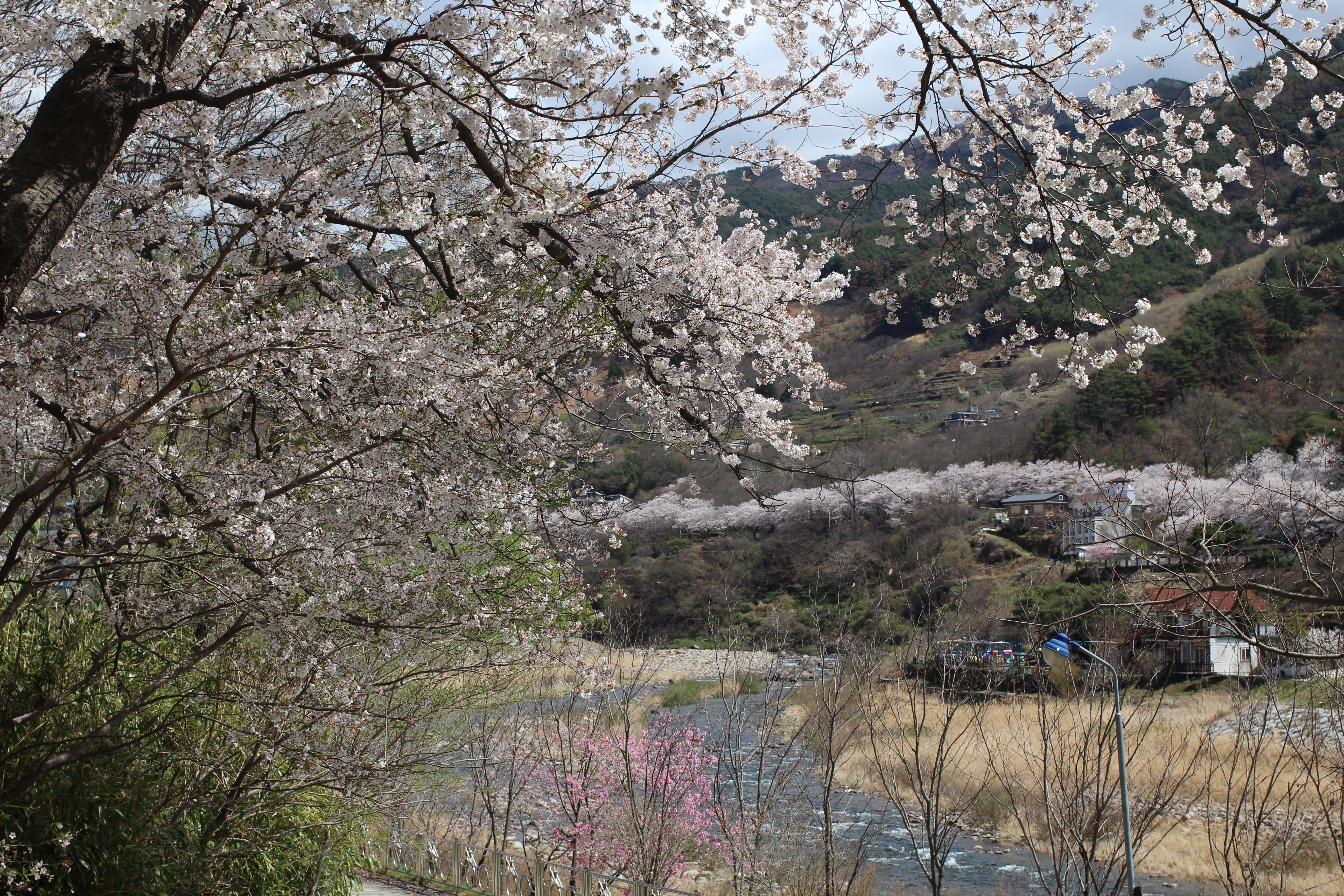 잠시 길을 벗어나 섬진강 쪽으로 내려갔다. 강물은 푸르고 고요했다. 강변을 따라 심어진 벚나무들이 흰 띠처럼 길게 이어졌고, 강 건너 화개장터와 마을이 산을 배경 삼아 그림처럼 펼쳐졌다. 강과 꽃과 산이 하나로 어우러지는 이 풍경이 왜 사람들을 매년 이 길로 부르는지 단번에 이해됐다.