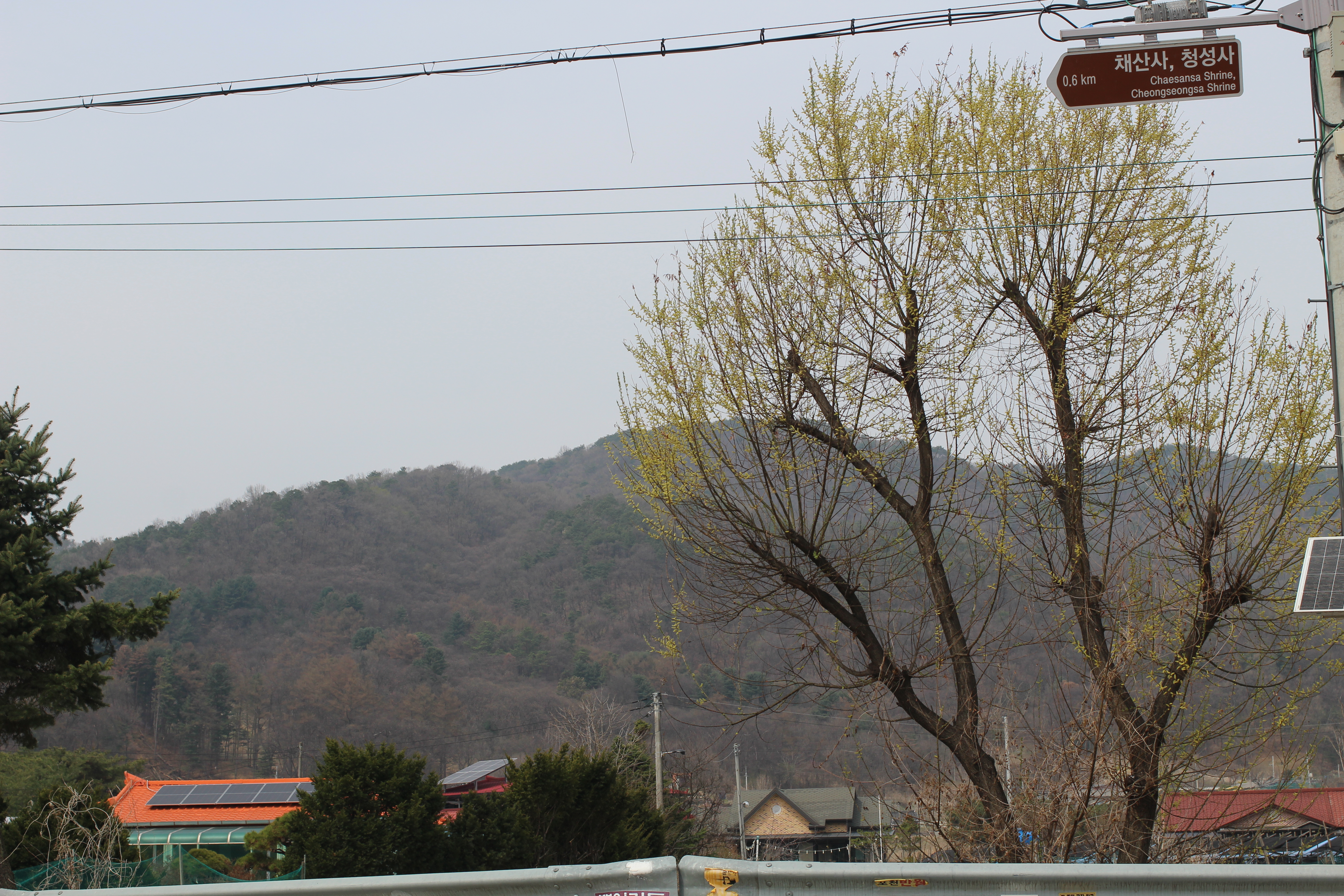 채산사, 청성사 가는 길목. 표지판 아래로 나무들이 막 새잎을 틔우고 있었다. 그리고 그 옆 언덕에는 개나리가 노랗게 폭발하고 있었다. 분홍 진달래와 나란히. 한국의 봄 언덕은 이 두 색의 조합으로 완성된다.