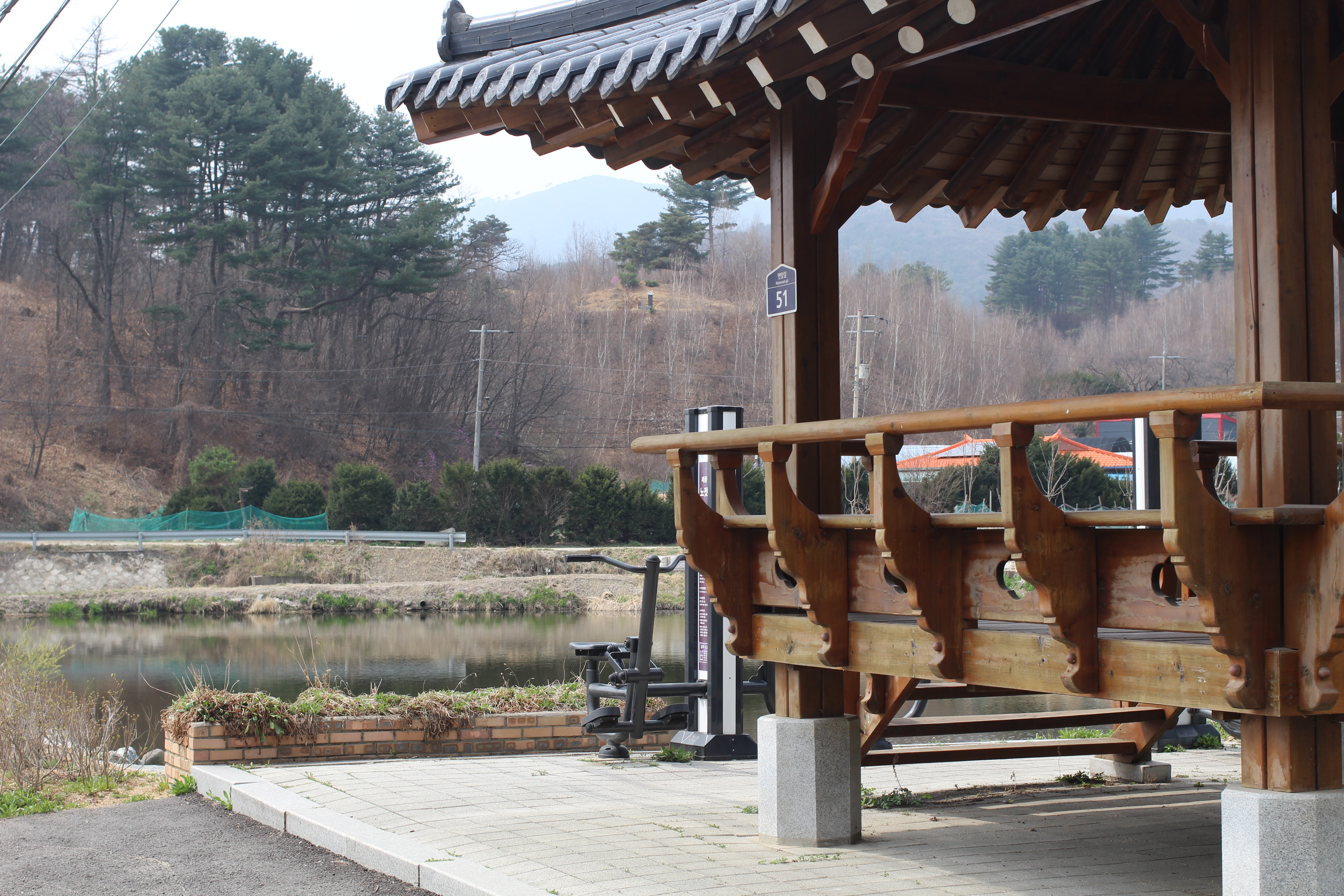 전통 정자 처마 아래에 서니 작은 연못이 내려다보였다. 산과 하늘이 물에 비치고, 멀리 빨간 지붕이 보였다. 아직 벚나무들은 꽃을 피우지 않았지만, 가지 끝에 분홍빛이 맺혀 있었다. 며칠만 더 있으면.