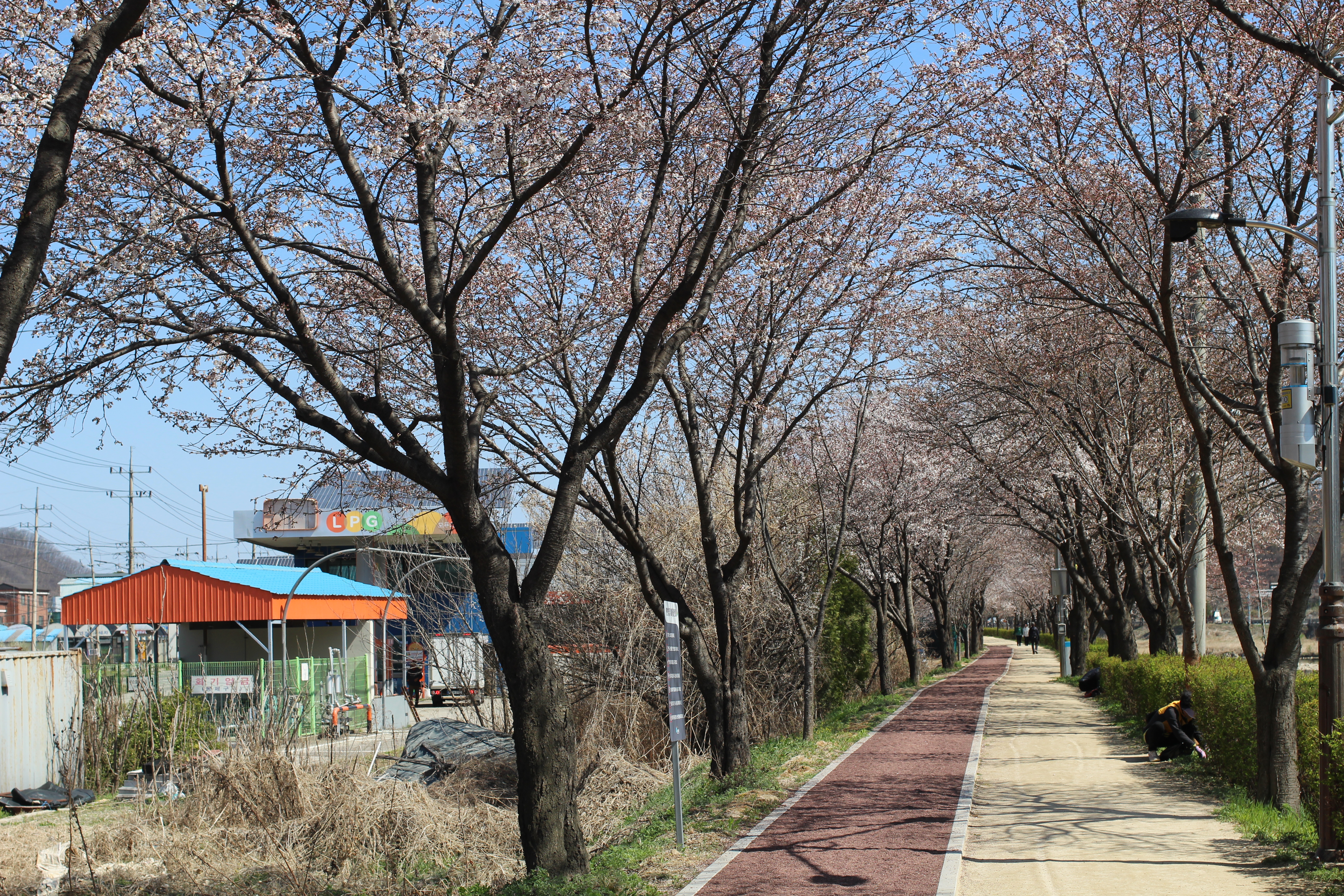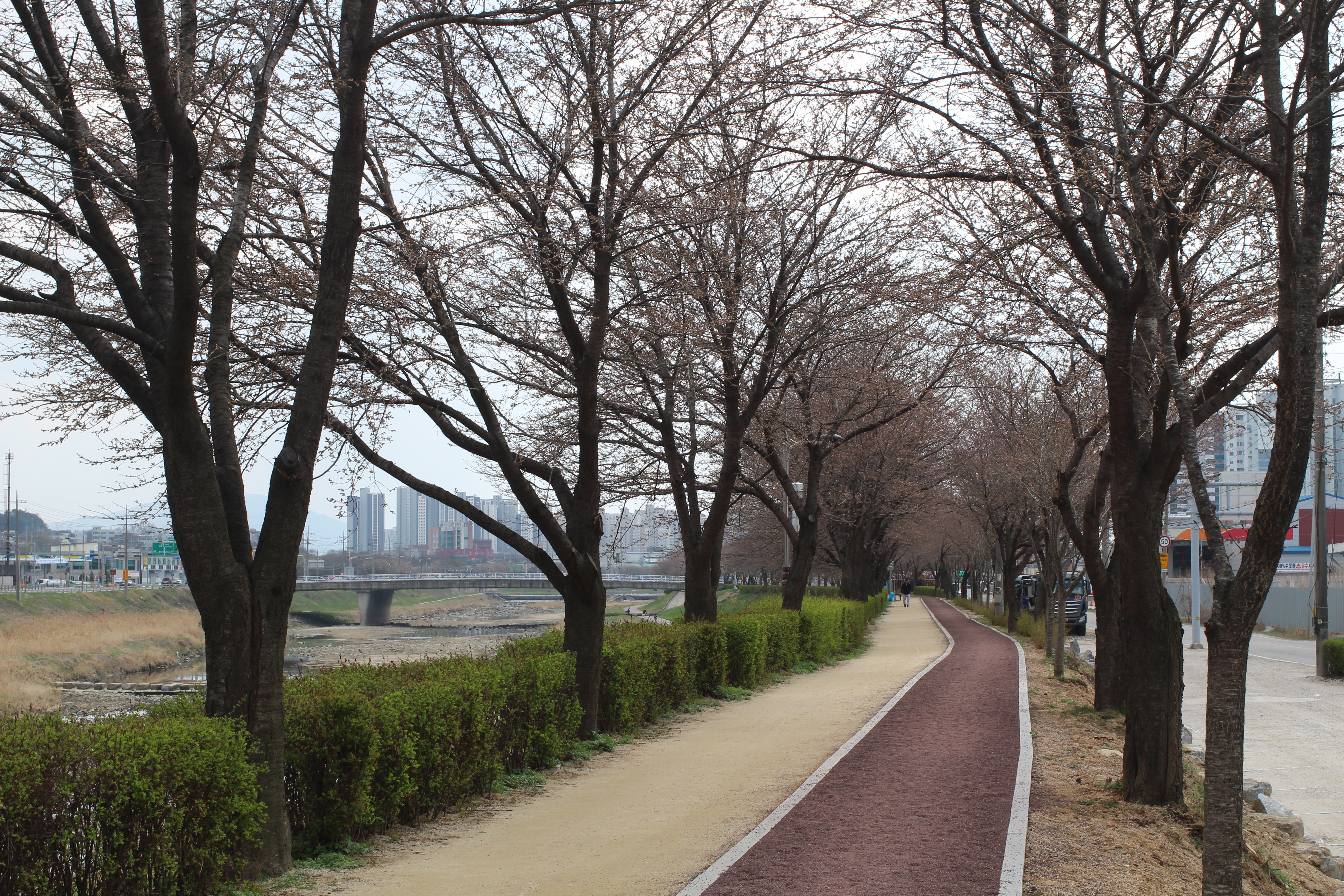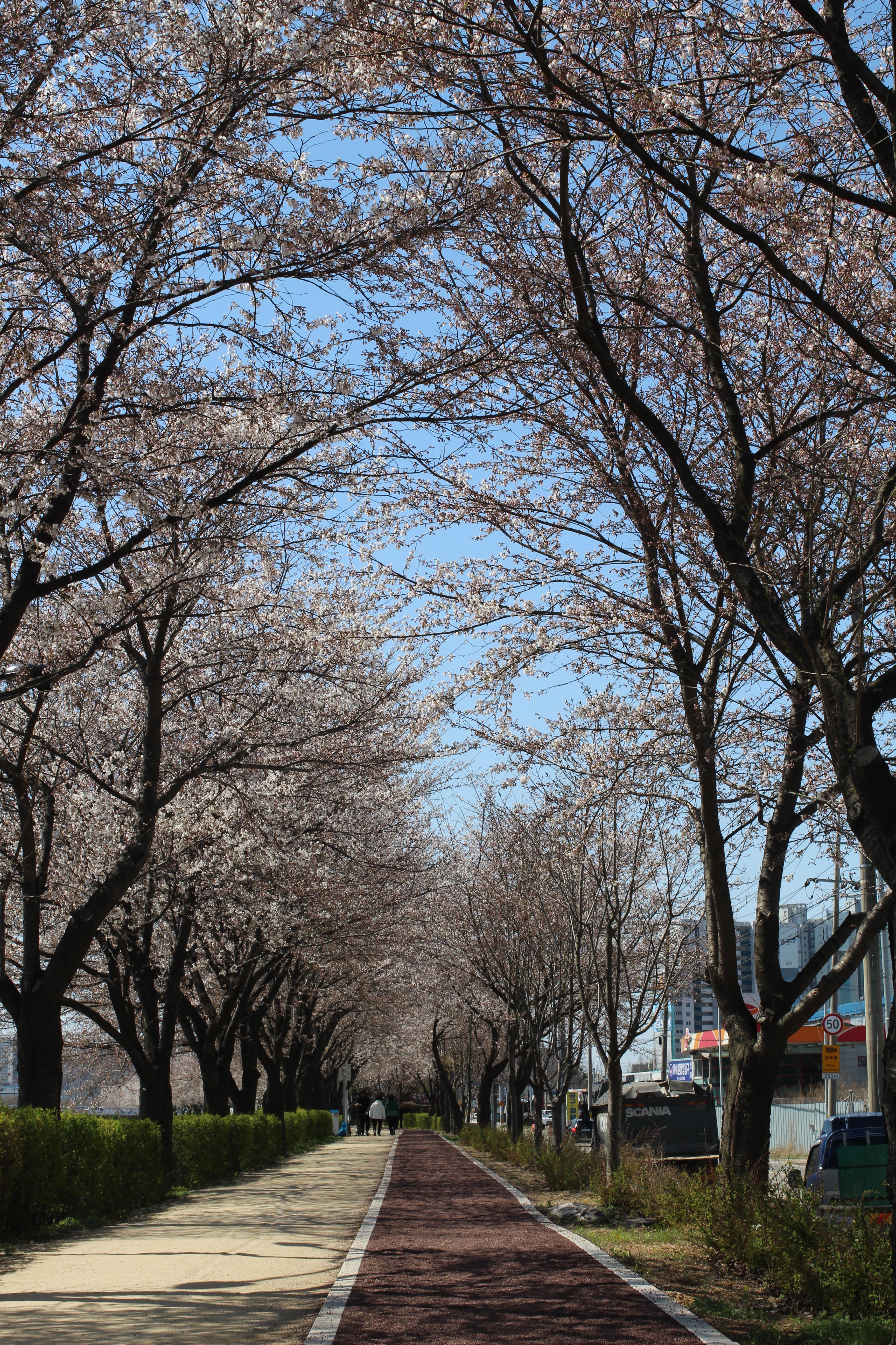 처음 이 길을 찾았을 때, 나무들은 아직 잠들어 있었다. 가지마다 작은 꽃망울들이 맺혀 있긴 했지만 아직 열릴 준비가 덜 된 모습이었다. 빨간 황토 자전거 길과 회색 보행로가 나란히 뻗어 있고, 나무들은 그 위로 가지를 뻗어 터널의 형태를 이미 만들고 있었다.