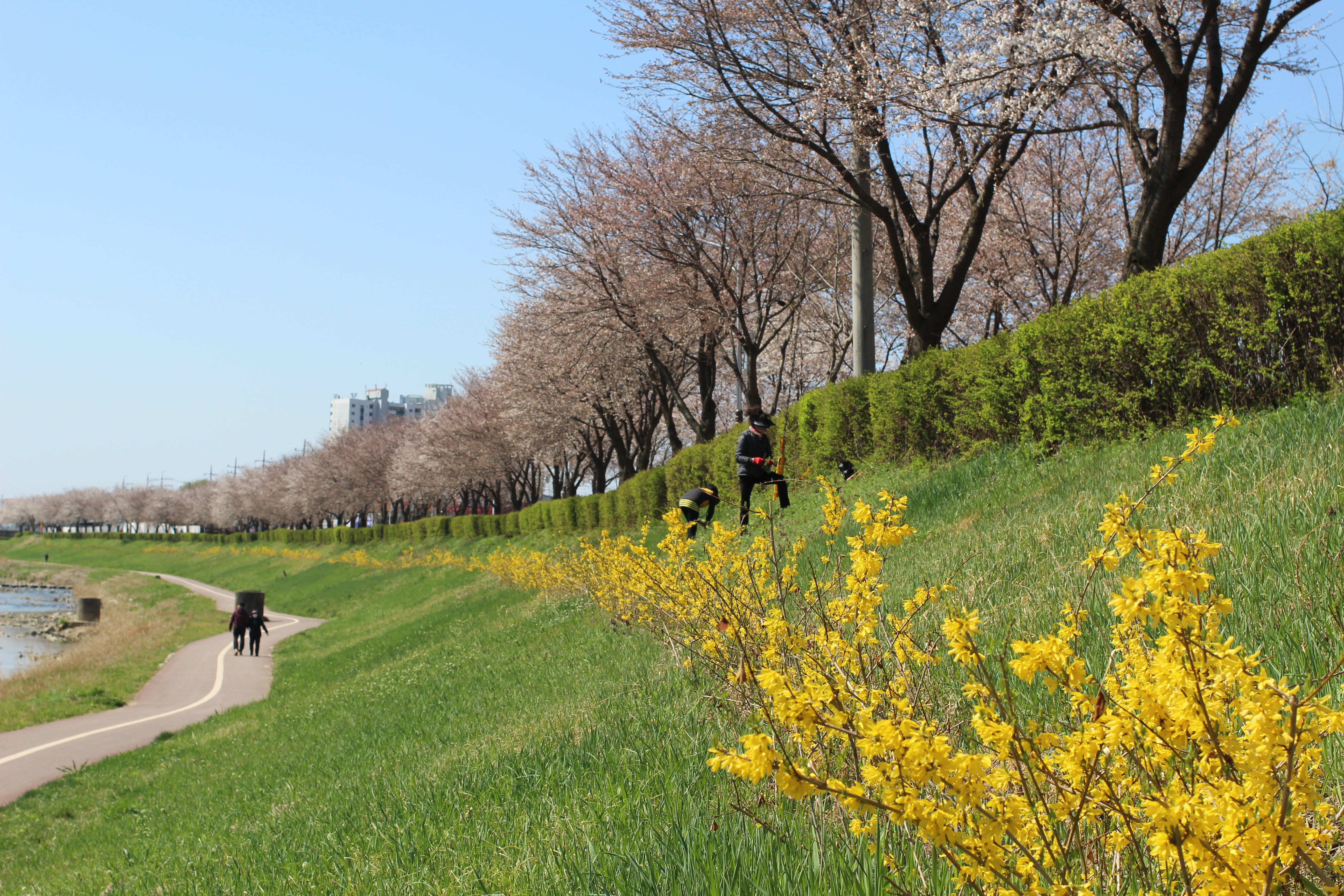 개나리는 벚꽃보다 조금 먼저 피기 시작해, 벚꽃나무가 만개할 즈음에는 한창 절정을 맞는다. 이 두 꽃이 동시에 피어 있는 짧은 시간, 포천천 둔치는 가장 화려한 봄빛을 뽐낸다.