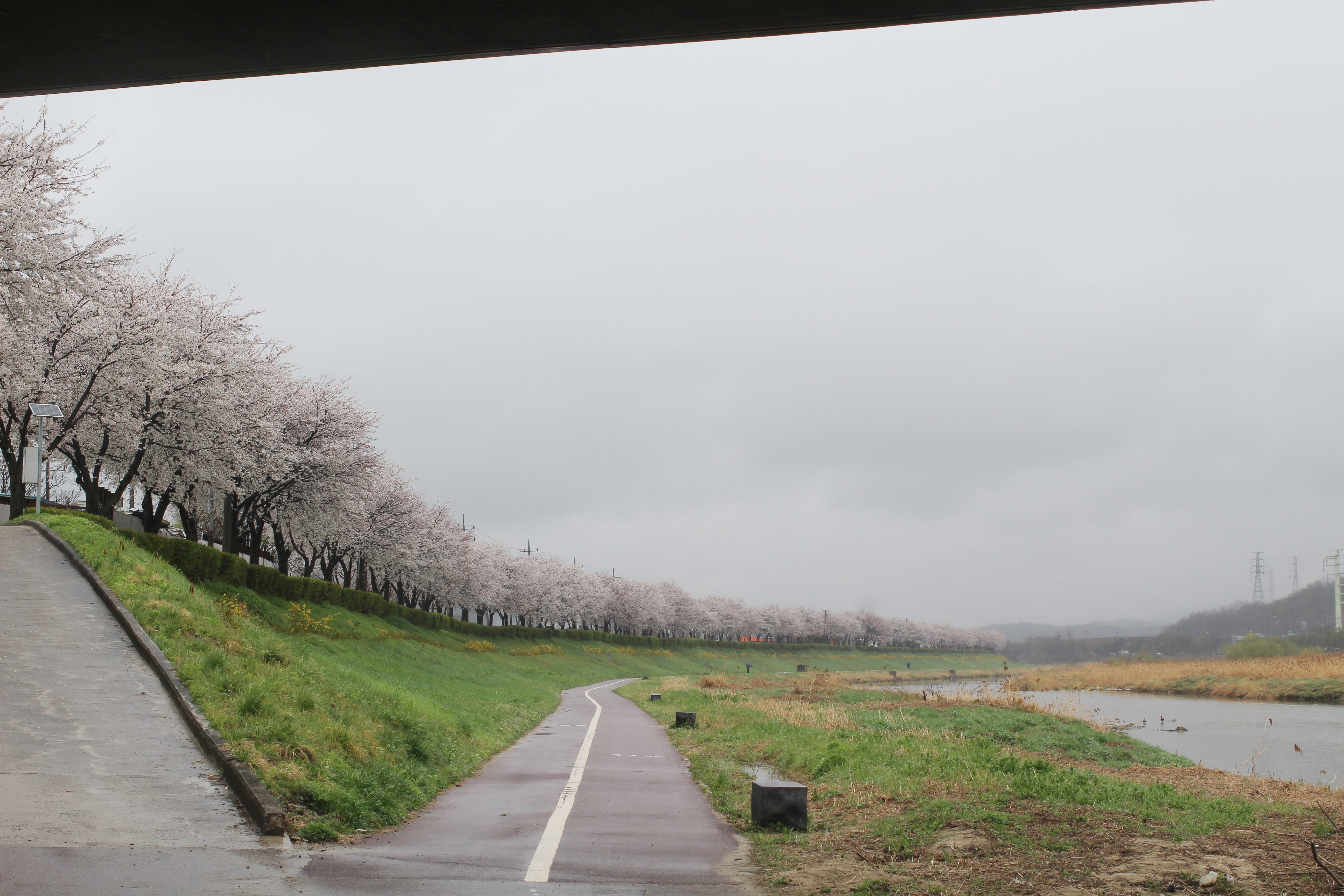 다리 아래를 지나니 도시의 풍경이 펼쳐졌다 강변을 따라 이어지는 벚꽃 터널, 그 사이로 자전거를 타는 두 사람의 실루엣. 비 오는 날에도 봄을 즐기러 나온 사람들.