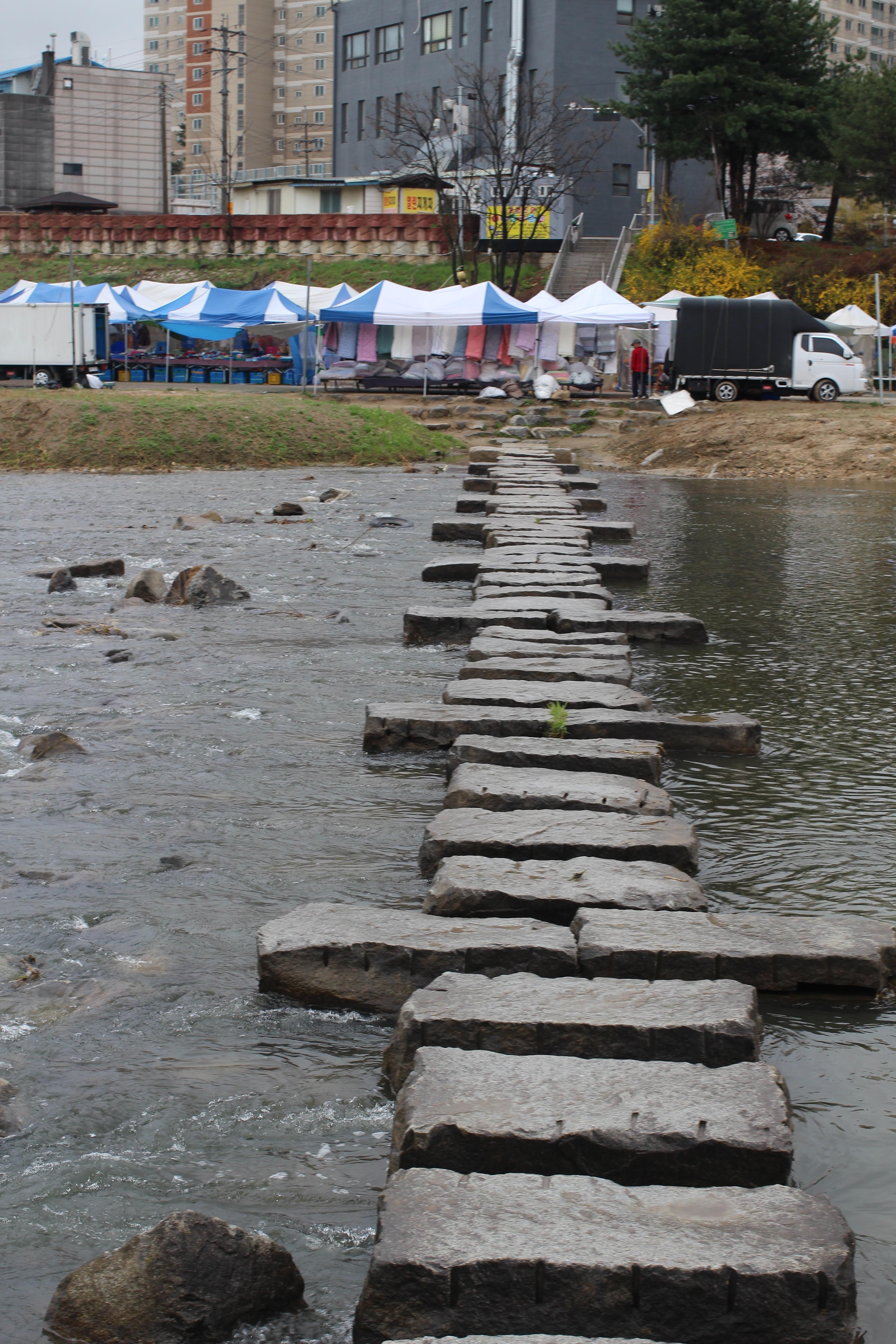 섶다리(징검다리)를 건너 장 안으로 들어갔다. 납작하고 넓은 돌들이 일렬로 늘어선 그 다리가 참 마음에 들었다. 물이 불어 돌 위를 아슬아슬하게 밟으며 건너는 재미도 있었다.