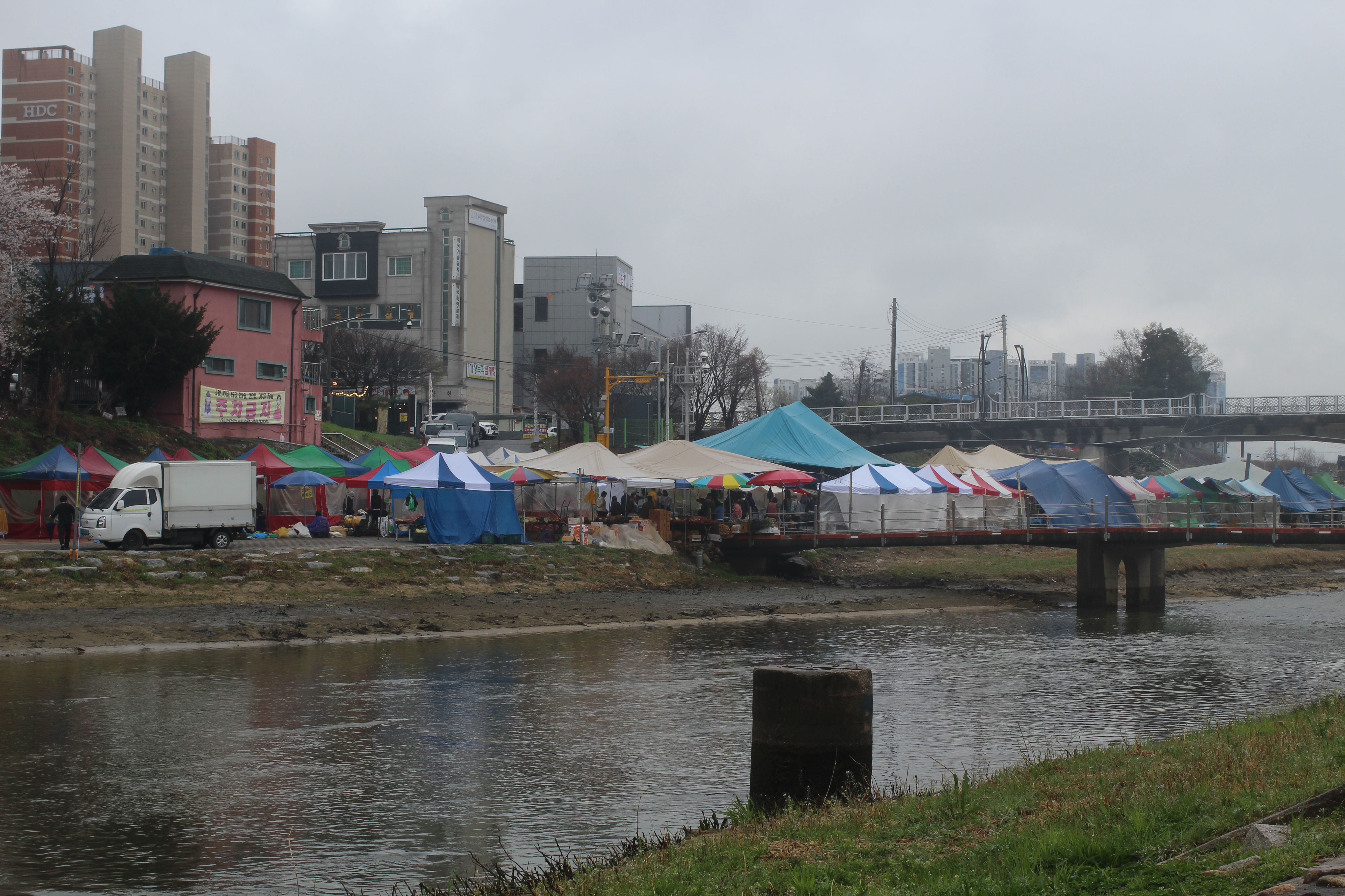 강변 둔치를 따라 알록달록한 천막이 줄지어 늘어서 있었다. 파란 것, 흰 것, 빨간 것 비 오는 날씨에도 장사꾼들은 어김없이 자리를 펼쳤다. 트럭마다 짐을 가득 싣고 와서 저마다의 살림살이를 꺼내놓은 모습이 정겨웠다.